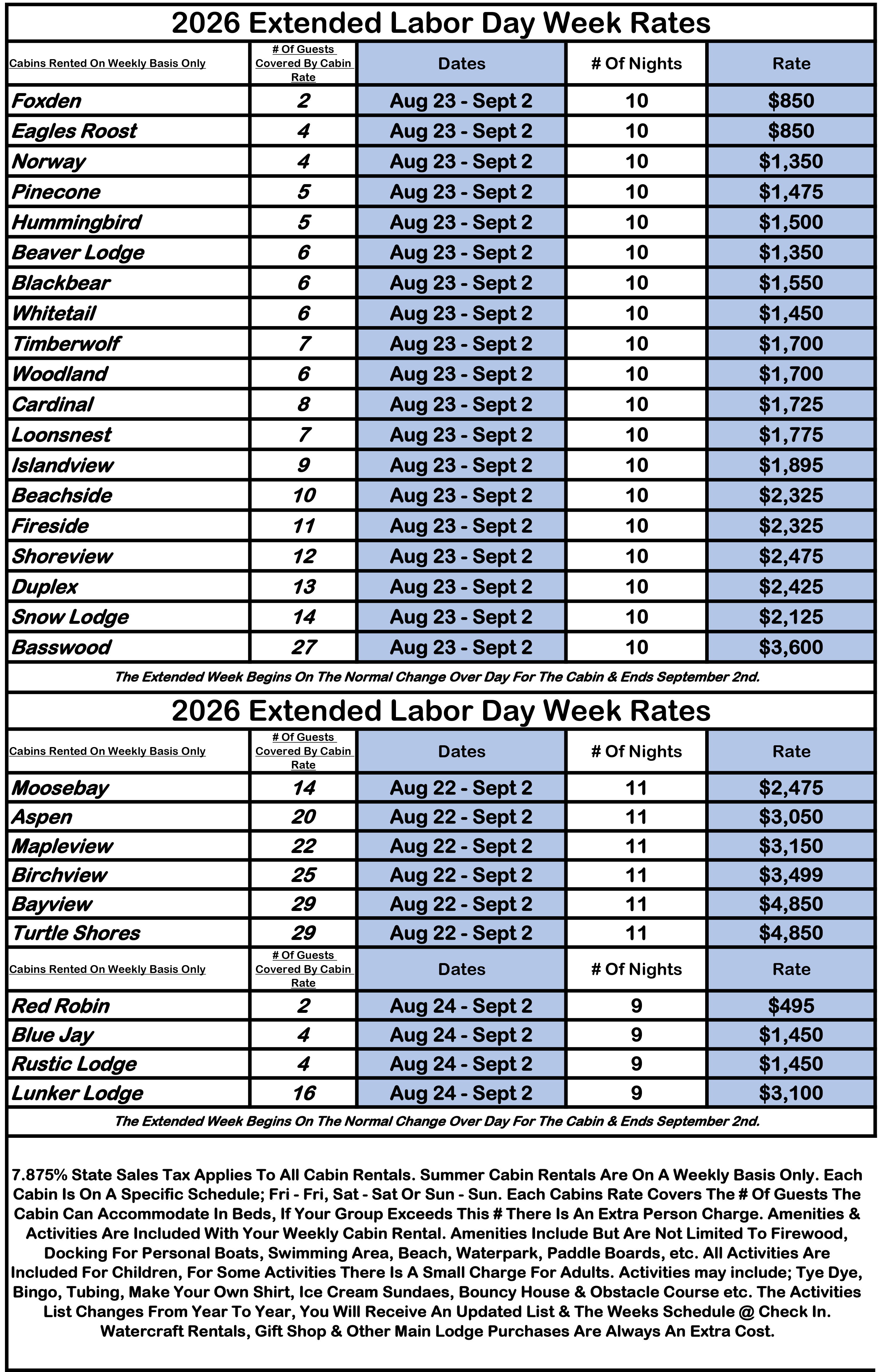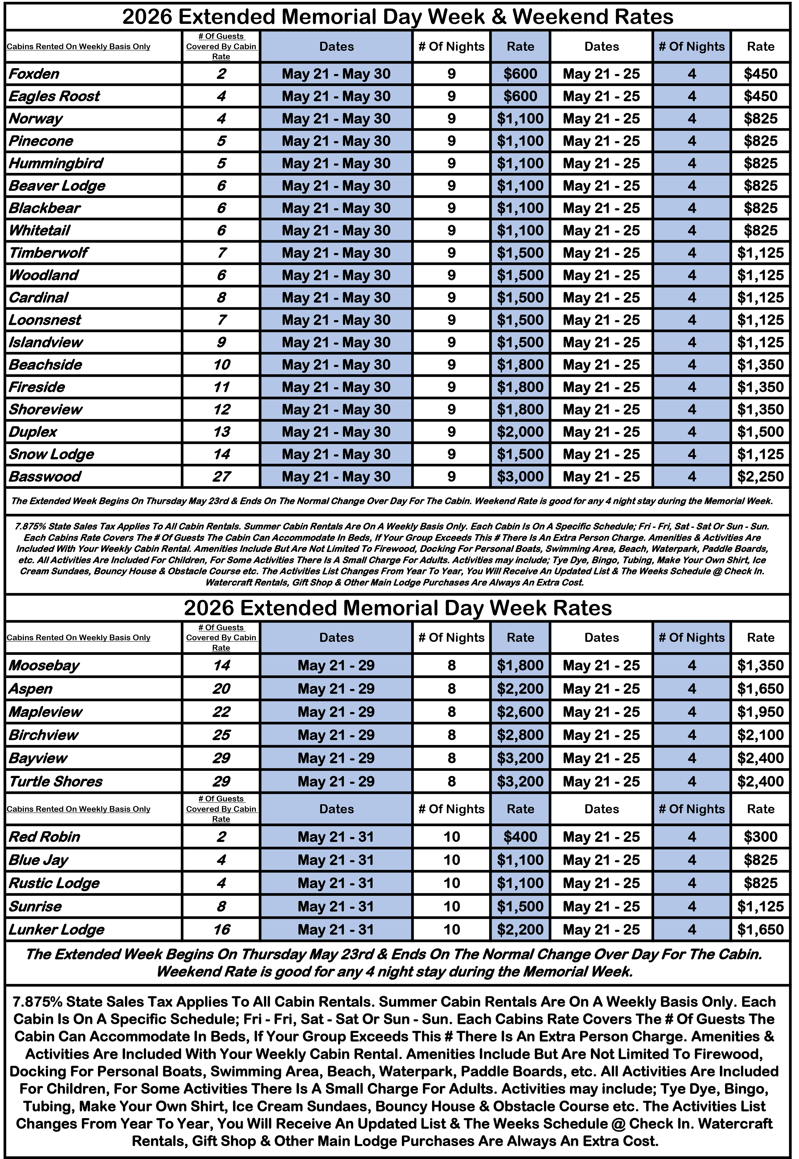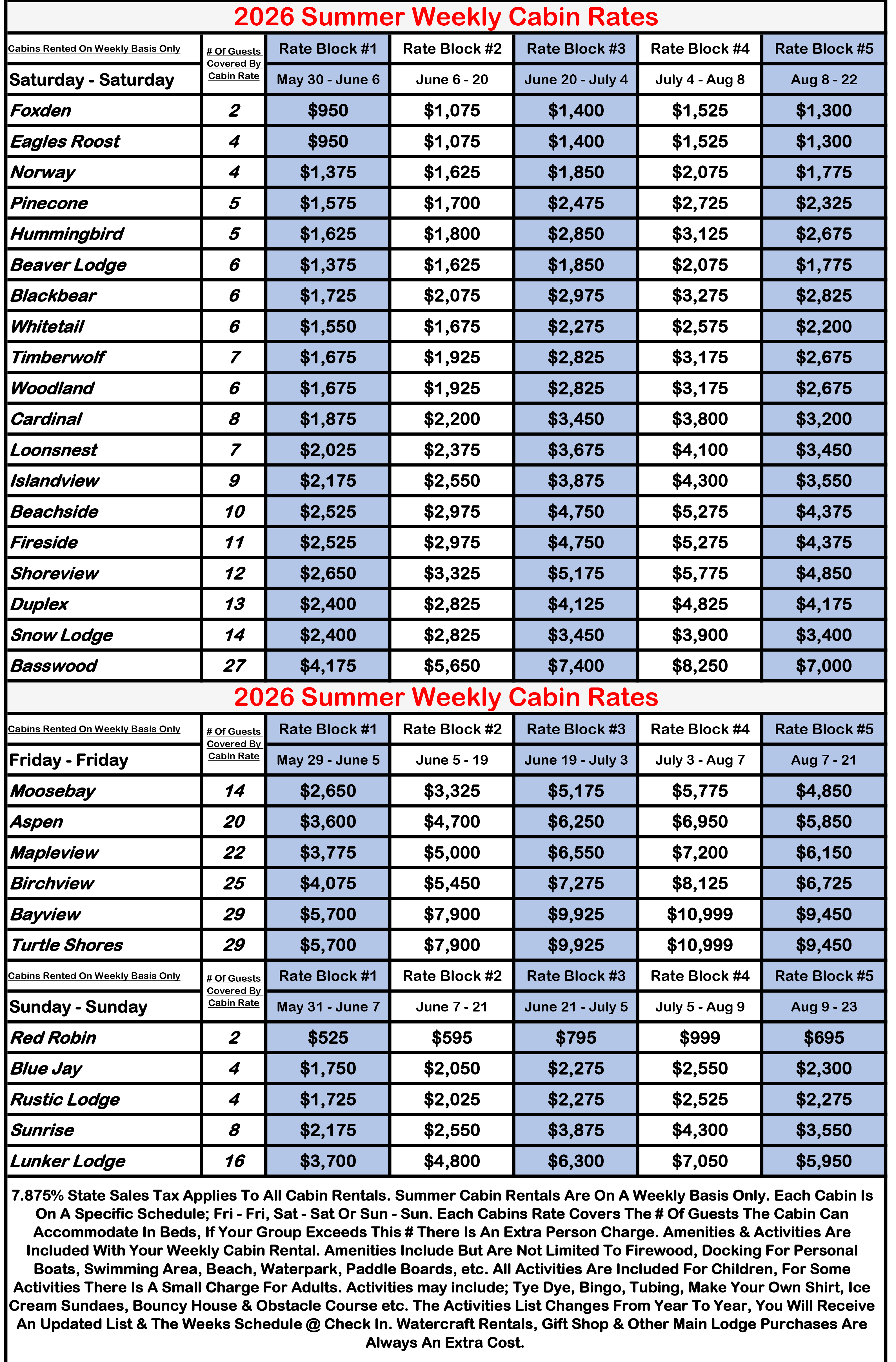 1 - 2 Bedroom Cabins = $300 ~ 3 Bedroom Cabins = $500 ~ 4 Bedroom Cabins = $600